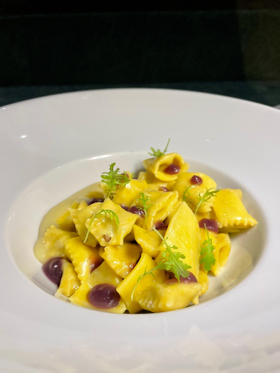 zucca, funghi, nocciole, tricotta e crema di sedano rapa